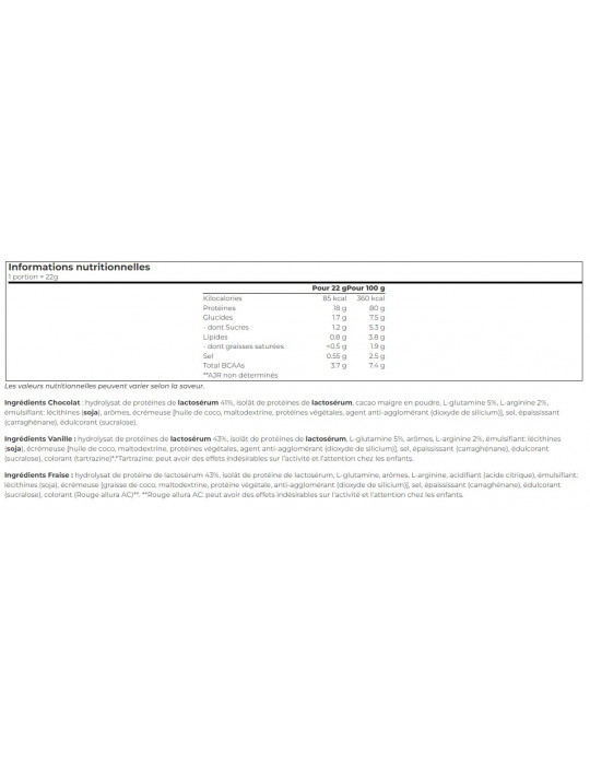 [huile de coco, maltodextrine, protéines végétales, agent anti-agglomérant (dioxyde de silicium)]Ingredienti Vaniglia: idrolizzato di proteine del siero di latte 43%, proteine del siero di latte isolate, L-glutammina 5%, aromi, L-arginina 2%, emulsionante: lecitine(soia), scremante, sale, addensante (carragenina), edulcorante (sucralosio), colorante (tartrazina)*. *Tartrazina: può avere effetti indesiderati sull'attività e l'attenzione nei bambini.