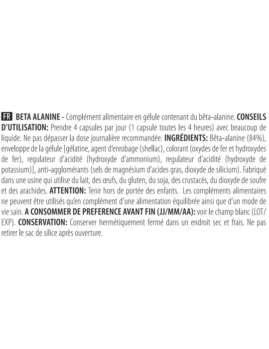 [gélatine, agent d’enrobage (shellac), colorant (oxydes de fer et hydroxydes de fer), régulateur d’acidité (hydroxyde d’ammonium), régulateur d’acidité (hydroxyde de potassium)]INGREDIENTI: Beta Alanina (84%), involucro della capsula, agenti antiagglomeranti (sali di magnesio degli acidi grassi, biossido di silicio).