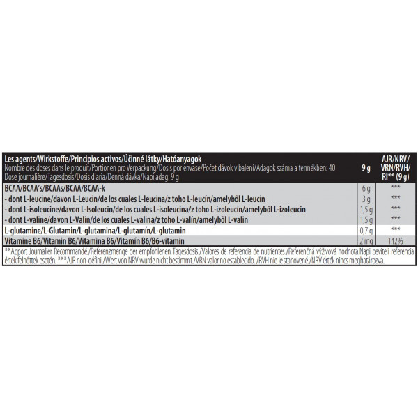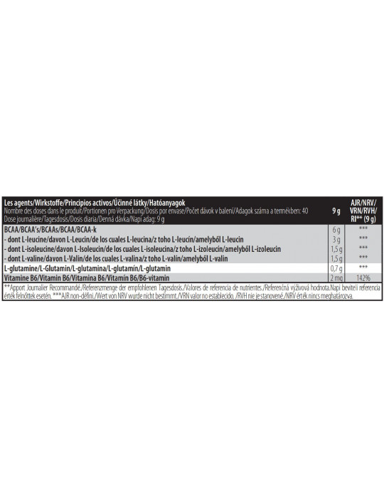 Ingredienti Frutti tropicali: 33% di L-leucina istantanea (L-leucina, emulsionante: lecitine, maltodestrina), 17% di L-isoleucina, 17% di L-valina, 8% di L-glutammina, aromi, acidificante (acido citrico), antiagglomerante (biossido di silicio), edulcorante (sucralosio), sale, piridossina cloridrato, coloranti (tartrazina, Allura Red AC)*.