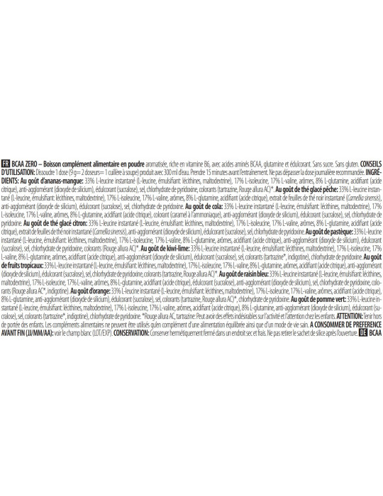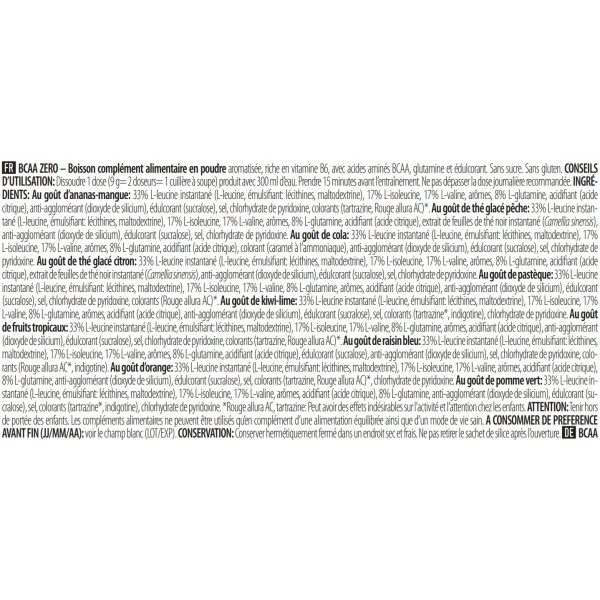 Ingredienti Tè freddo alla pesca: 33% di L-leucina istantanea (L-leucina, emulsionante: lecitine, maltodestrina), 17% di L-isoleucina, 17% di L-valina, aromi, 8% di L-glutammina, acidificante (acido citrico), estratto istantaneo di foglie di tè nero (Camellia sinensis), antiagglomerante (biossido di silicio), edulcorante (sucralosio), sale, piridossina cloridrato.
