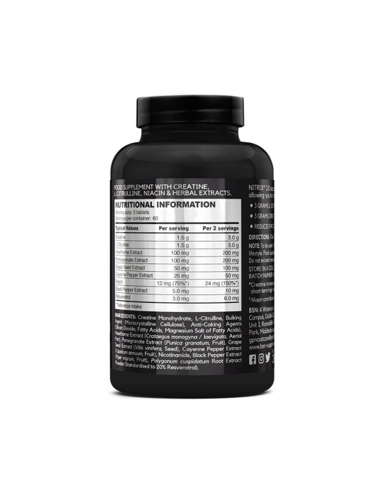Ingredienti: Creatina monoidrato, L-citrullina, agente di carica (cellulosa microcristallina), agente antiagglomerante (biossido di silicio, sali di magnesio degli acidi grassi), estratto di biancospino(Crataegus monogyna/laevigata, parte aerea), estratto di melograno(Punica granatum, frutto), estratto di semi d'uva(Vitis vinifera, seme), estratto di pepe di Cayenna(Capsicum annuum, frutto), estratto di radice di Polygonum cuspidatum in polvere (estratto standardizzato al 20% di resveratrolo), nicotinamide, estratto di pepe nero(Piper nigrum, frutto).