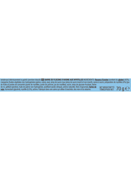 Ingredienti della fragranza al mirtillo :fiocchi d'avena (contiene glutine) (42%), margarina [huiles végétales non-hydrogénées (palme, colza), eau], sciroppo di zucchero di canna (sciroppo di zucchero invertito e non invertito), zucchero di canna, preparazione di mirtilli (4%) [jus de fruits et purées de concentré (purée de myrtilles, purée de pomme, jus de myrtilles), sucre, sirop de glucose-fructose, farine de riz, gélifiant (pectine), huile de palme non-hydrogénée, acidifiant (acide citrique), arôme naturelle, fibre d’agrumes], , farina di soia, umettante (glicerolo), mirtillo (0,5%), aroma.