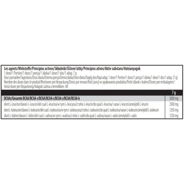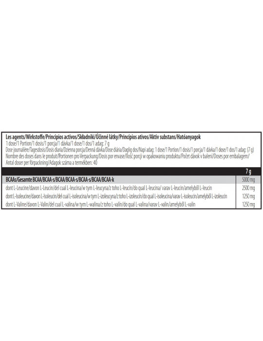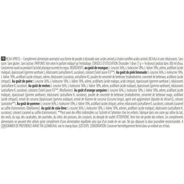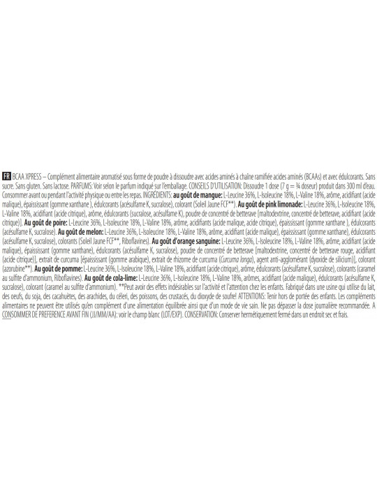 Ingredienti del mango: L-leucina 36%, L-isoleucina 18%, L-valina 18%, aroma, acido malico, addensante (gomma xantana), edulcoranti (sucralosio, acesulfame K), colorante (FCF* giallo sole). *Può avere effetti negativi sull'attività e l'attenzione nei bambini.