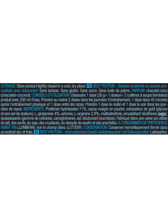 Ingredienti Choco-coconut : Proteine idrolizzate 71%, cacao magro in polvere, esaltatore di sapidità (glicina e suo sale di sodio), L-glutammina 4%, aromi, L-arginina 2,8%, maltodestrina, emulsionante: lecitina(soia), addensanti (gomma di cellulosa, carragenina), sale, edulcorante (sucralosio).