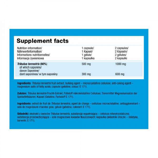 Ingredienti: estratto del frutto di Tribulus terrestris, agente di carica: cellulosa microcristallina, agente antiagglomerante: sali di magnesio degli acidi grassi, capsula: gelatina, colorante (E171).