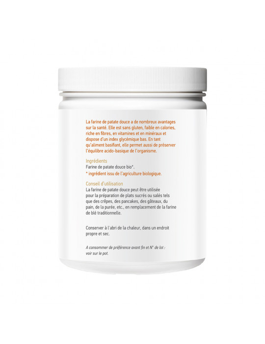 La farina di patate dolci biologica è ricca di fibre, antiossidanti, vitamine e minerali e soprattutto ha un basso indice glicemico. Molto interessante dal punto di vista nutrizionale se si fa sport o se si tiene sotto controllo l'apporto calorico nell'ambito di una dieta.