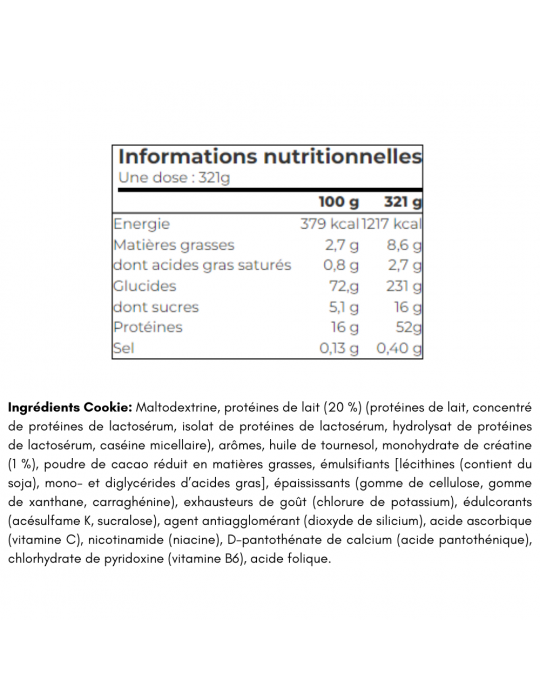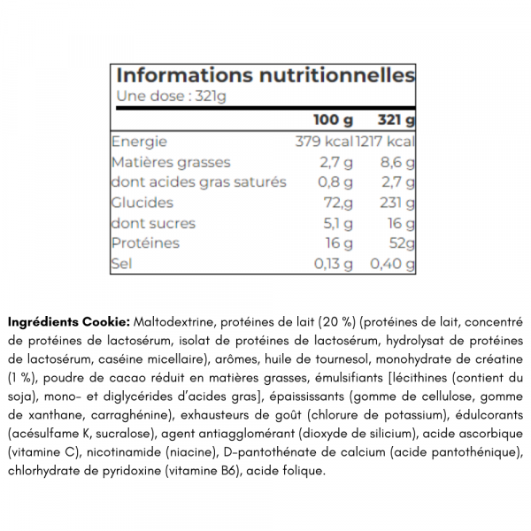 Maltodestrina, proteine del latte (20%) [proteine del latte, proteine del siero del latte concentrate(latte), proteine del siero del latte isolate(latte), idrolizzato di proteine del siero del latte(latte), caseina micellare(latte)], cacao magro in polvere, olio di girasole, aromi, creatina monoidrato (1%), emulsionanti [lecitina (contiene soia), mono- e digliceridi degli acidi grassi], addensanti (gomma di cellulosa, gomma di xanthan, carragenina), esaltatore di sapidità (cloruro di potassio), edulcoranti (acesulfame-K, sucralosio), antiagglomerante (biossido di silicio), acido ascorbico (vitamina C), nicotinamide (niacina), calcio D-pantotenato (acido pantotenico), piridossina cloridrato (vitamina B6), acido folico.