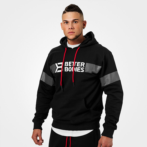 Better Bodies La felpa presenta il logo stampato sul petto e una striscia decorativa sulle braccia e sulla schiena. C'è anche una tasca a canguro per le chiavi, la tessera della palestra o il telefono. I polsini sono a coste sul fondo delle maniche.