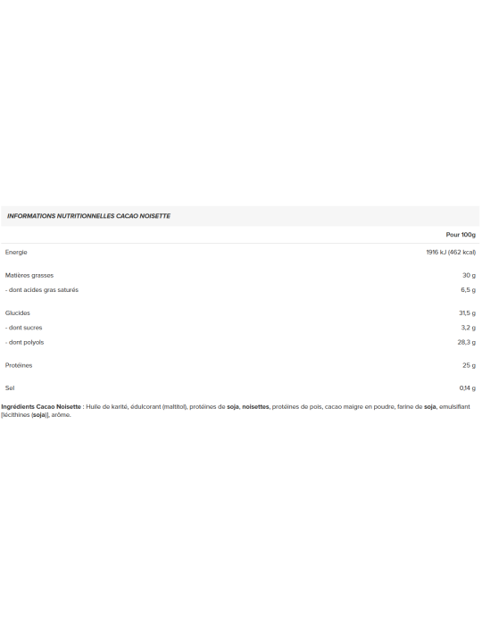 Ingredienti cacao nocciola :Edulcorante (maltitolo), proteine del siero di latte ( latte ) 29,5%, oli e grassi vegetali (colza, cacao e burro di girasole), nocciole 10%, cacao magro in polvere 8%, inulina, emulsionante: lecitina (soia), aroma naturale.
