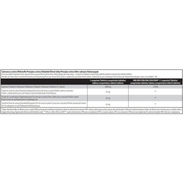[stabilisants (copolymère greffé d’alcool polyvinylique et de polyéthylèneglycol, alcool polyvinylique), anti-agglomérants (talc, mono- et diglycérides d’acides gras)]Ingredienti: acido L-ascorbico, agenti di carica (gel di cellulosa), amido di mais, rivestimento, preparazione vegetale in polvere (polvere di rosa canina 1,7%, maltodestrina, polvere di fiori di sambuco 0,24%), scorza di limone in polvere 2,4%, agenti antiagglomeranti (sali di magnesio degli acidi grassi, biossido di silicio).