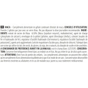 Ingredienti : [Maca (Lepidium meyenii), maltodextrine] [gélatine, agent d’enrobage (shellac), colorant (oxydes de fer et hydroxydes de fer), régulateur d’acidité (hydroxyde d’ammonium), régulateur d’acidité (hydroxyde de potassium)] Estratto di radice di Maca 62,8%, agente di carica (fosfati di calcio), involucro della capsula, agenti antiagglomeranti (sali di magnesio degli acidi grassi, biossido di silicio).