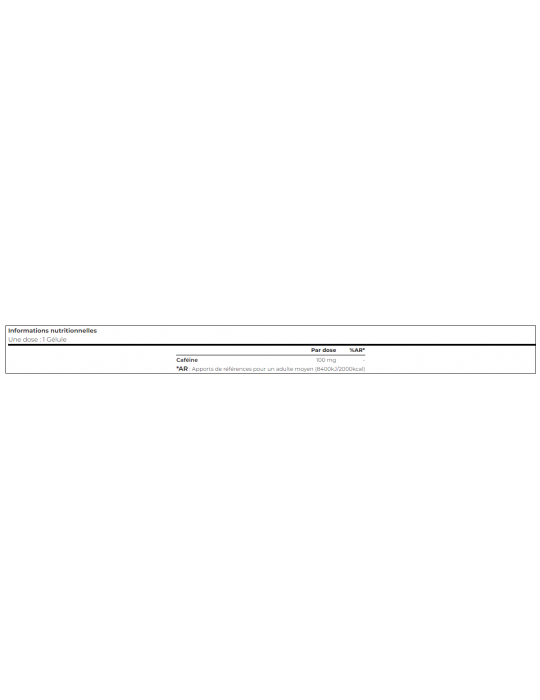 Peso netto : 50 gAssumere 1 capsula al giorno, da 30 minuti a 1 ora prima dello sport. La caffeina aiuta a migliorare la concentrazione.
