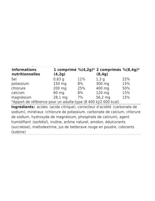 Ingredienti Pompelmo rosa: acidificante (acido citrico), regolatore di acidità (carbonato di sodio), cloruro di potassio, umettante (sorbitolo), inulina, carbonato di calcio, cloruro di sodio (CH: sale), caffeina (75 mg/tablet), idrossido di magnesio, aroma naturale, fosfato tricalcico, amido, edulcorante (sucralosio), maltodestrina, succo di barbabietola rossa in polvere, colorante (luteina).