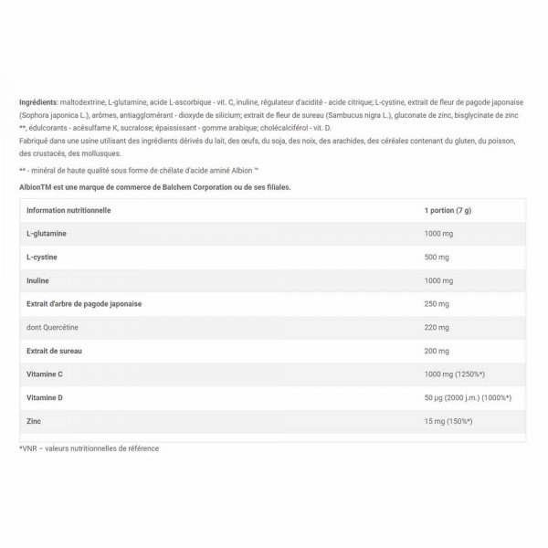 Ingredienti : maltodestrina, L-glutammina, acido L-ascorbico - vit. C, inulina, regolatore di acidità - acido citrico; L-cistina, estratto di fiori di pagoda giapponese (Sophora japonica L.), aromi, antiagglomerante - biossido di silicio; estratto di fiori di sambuco (Sambucus nigra L.), zinco gluconato, zinco bisglicinato*, edulcoranti - acesulfame K, sucralosio; addensante - gomma arabica; colecalciferolo - vit. D.