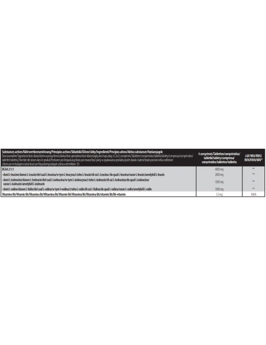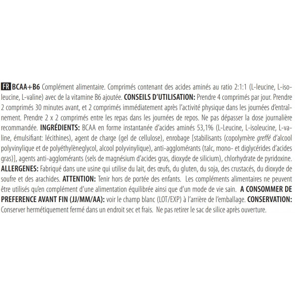 Ingredienti : [stabilisants (copolymère greffé d'alcool polyvinylique et de polyéthylèneglycol, alcool polyvinylique), anti-agglomérants (talc, mono- et diglycérides d'acides gras)] BCAA istantanei 53,1% (L-leucina, L-isoleucina, L-valina, emulsionante: 0), agente di carica (gel di cellulosa), rivestimento, agenti antiagglomeranti (sali di magnesio degli acidi grassi, biossido di silicio), piridossina cloridrato.
