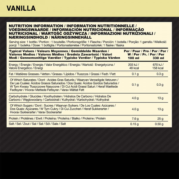 Ingredienti Vaniglia: latte scremato (80%), acqua, concentrato di proteine del latte (5,8%), aroma, stabilizzanti (gomma di gellano, carragenina), regolatore di acidità (citrato trisodico), colorante (curcumina), edulcorante (sucralosio).