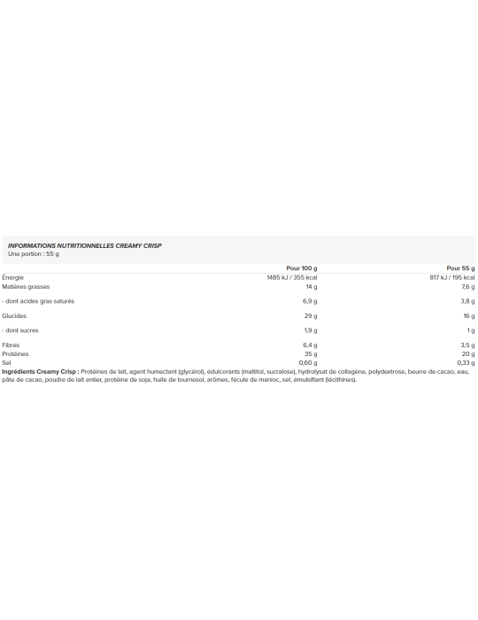 Ingredienti CRUNCHY-FUDGEProteine di latte, idrolizzato di collagene, umettante (glicerolo), edulcorante (maltitolo), polidestrosio, burro di cacao, acqua, cacao in polvere latte farina integrale, spolvero (edulcorante (maltitolo), fecola di patate, farina di riso, burro di cacao), olio di girasole, pasta di cacao, mandorle, aromi, cacao, sale, emulsionante (lecitina di destrosio) soia), edulcorante (sucralosio). Può contenere tracce di di uova, di glutine e altri dadi