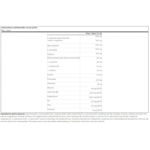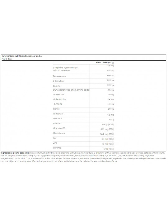 Ingredienti pesca :Destrosio 62%, L-arginina cloridrato 8,8%, beta-alanina 8,2%, L-citrullina 5,9%, acidificante (acido citrico), aromi, caffeina anidra 1,2%, sali di magnesio dell'acido citrico, agente antiagglomerante (biossido di silicio), sali di calcio dell'acido citrico, L-leucina 0,4%, edulcorante (sucralosio), ossido di magnesio, L-isoleucina 0,2%, L-valina 0,2%, acido nicotinico, fumarato ferroso, coloranti (tartrazina1, indigotina), ossido di zinco, cloridrato di piridossina, cloruro di cromo (III) e suo esaidrato. 1Tartrazina: può avere effetti negativi sull'attività e l'attenzione nei bambini.