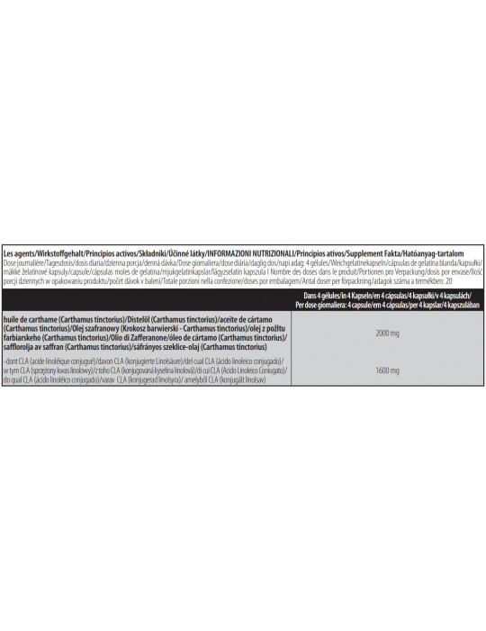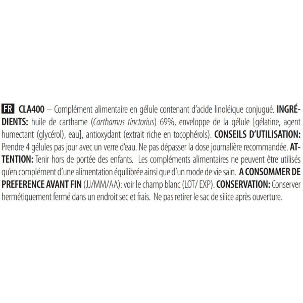 Aiuta quindi il vostro corpo a dimagrire e i vostri muscoli a tonificarsi! Ogni dose di CLA 400 contiene 1600 mg di CLA. Questo prodotto non contiene stimolanti.