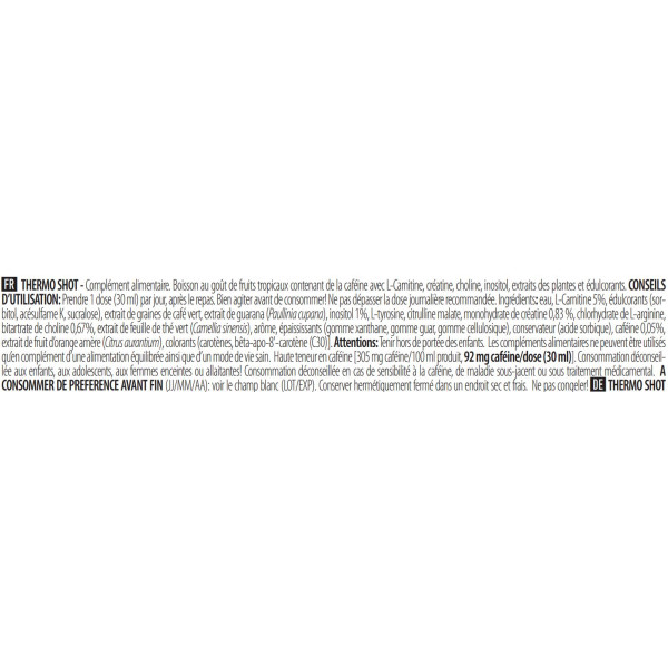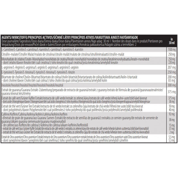 Ingredienti: acqua, L-carnitina acqua, L-Carnitina 5%, edulcoranti (sorbitolo, acesulfame K, sucralosio), estratto di semi di caffè verde, estratto di guaranà (Paullinia cupana), inositolo 1%, L-tirosina, citrullina malato, creatina monoidrato 0,83%, L-arginina cloridrato, colina bitartrato 0,67%, estratto di foglie di tè verde (Camellia sinensis), aroma, addensanti (gomma di xantano, gomma di guar, gomma di cellulosa), conservante (acido sorbico), caffeina 0,05%, estratto di frutti di arancia amara (Citrus aurantium), coloranti (caroteni, beta-apo-8'-carotene (C30)).