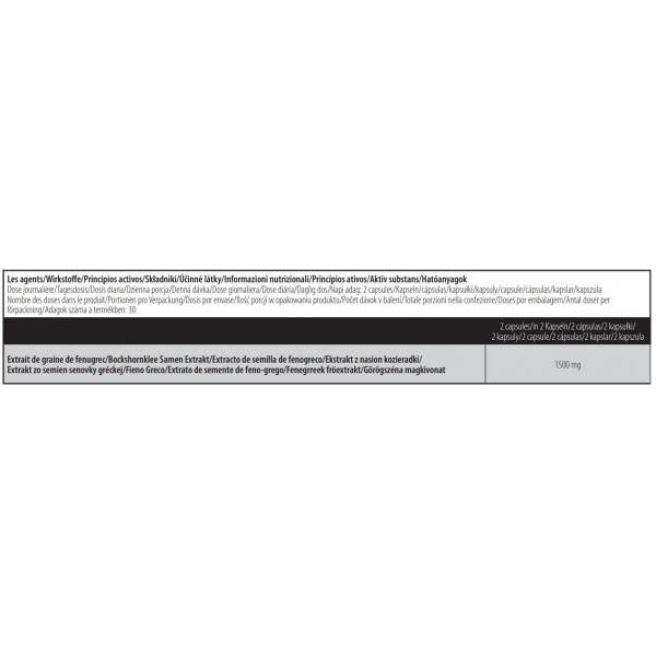 Ingredienti: [gélatine, agent d’enrobage (shellac), colorant (oxydes de fer et hydroxydes de fer), régulateur d’acidité (hydroxyde d’ammonium), régulateur d’acidité (hydroxyde de potassium)] Estratto di semi di fieno greco (Trigonella foenum-graecum) 74,2%, involucro della capsula, agente di carica (fosfati di calcio), agenti antiagglomeranti (sali di magnesio degli acidi grassi, biossido di silicio).