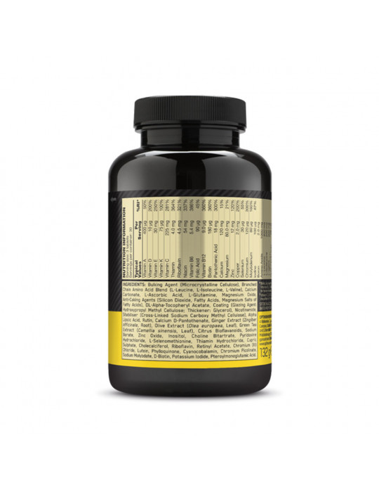 Ingredienti : Agente di carica (cellulosa microcistallina), miscela di aminoacidi a catena ramificata (L-leucina, L-isoleucina, L-valina), carbonato di calcio, acido L-ascorbico, L-glutammina, ossido di magnesio, agente antiagglomerante (biossido di silicio, acidi grassi, sali di magnesio degli acidi grassi), acetato di DL-alfa-tocoferile, rivestimento (agente di rivestimento: idrossipropilmetilcellulosa; addensante: Glicerolo), Nicotinamide, Stabilizzante (carbossimetilcellulosa sodica reticolata), Acido alfa-lipoico, Rutina, D-pantotenato di calcio, Estratto di zenzero (Zingiber officinale, radice), Estratto di oliva (Olea europaea, foglia), Bioflavonoidi di agrumi, Borato di sodio, Ossido di zinco, Inositolo, Colina bitartrato, Cloridrato di piridossina, L-selenometionina, cloridrato di tiamina, solfato di rame, colecalciferolo, riboflavina, acetato di retinile, cloruro di cromo, luteina, fillochinone, cianocobalamina, picolinato di cromo, molibdato di sodio, D-biotina, ioduro di potassio, acido pteroilmonoglutammico.