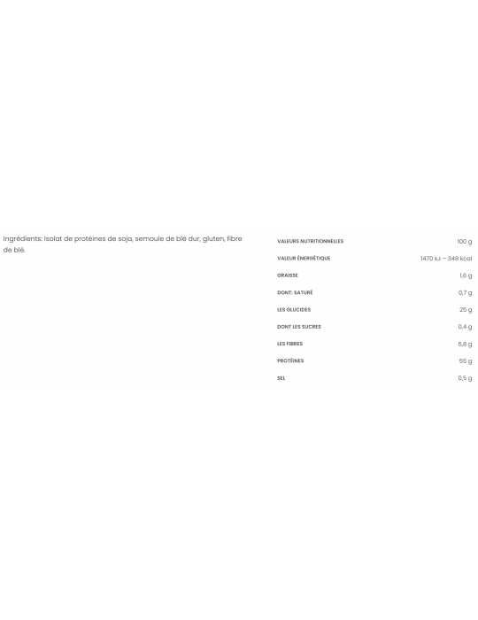 Ingredienti: proteine isolate di soia, semola di grano duro, glutine, fibra di grano.