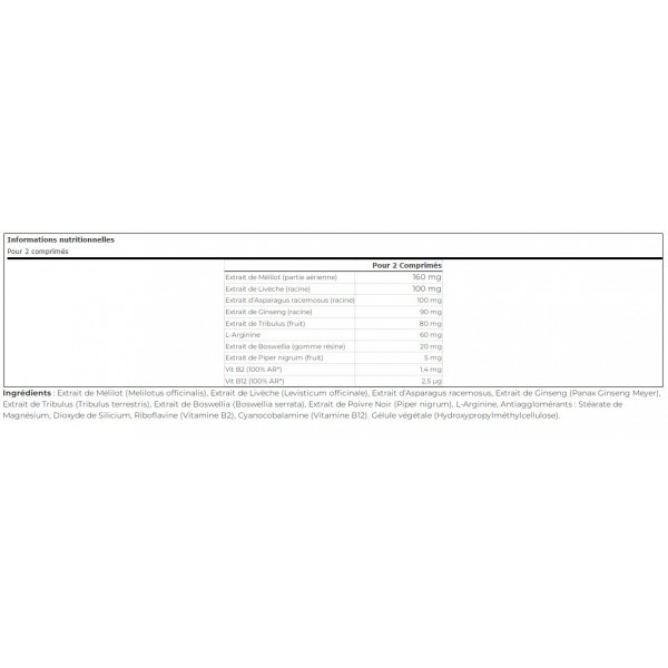 Ingredienti: Estratto di meliloto (Melilotus officinalis), estratto di levistico (Levisticum officinale), estratto di Asparagus racemosus, estratto di ginseng (Panax Ginseng Meyer), estratto di tribulus (Tribulus terrestris), estratto di boswellia (Boswellia serrata), estratto di pepe nero (Piper nigrum), L-arginina, Antiagglomeranti : Magnesio stearato, Biossido di silicio, Riboflavina (Vitamina B2), Cianocobalamina (Vitamina B12). Capsula vegetale (idrossipropilmetilcellulosa).