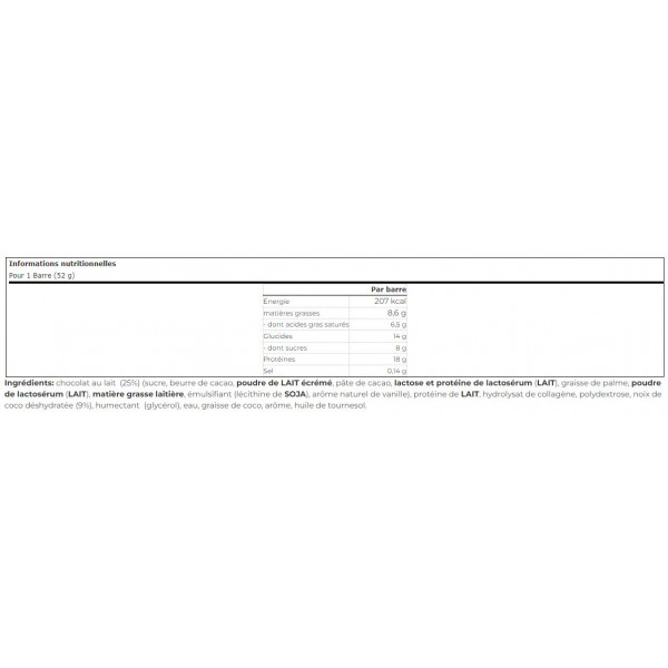 Ogni barretta da 52 g contiene 18 g di proteine. Il contenuto proteico proviene principalmente dal concentrato di proteine del siero del latte e dalle proteine del latte, per garantire un apporto costante nel tempo, consentendo la sintesi proteica più efficace possibile con l'obiettivo di costruire la massa muscolare.