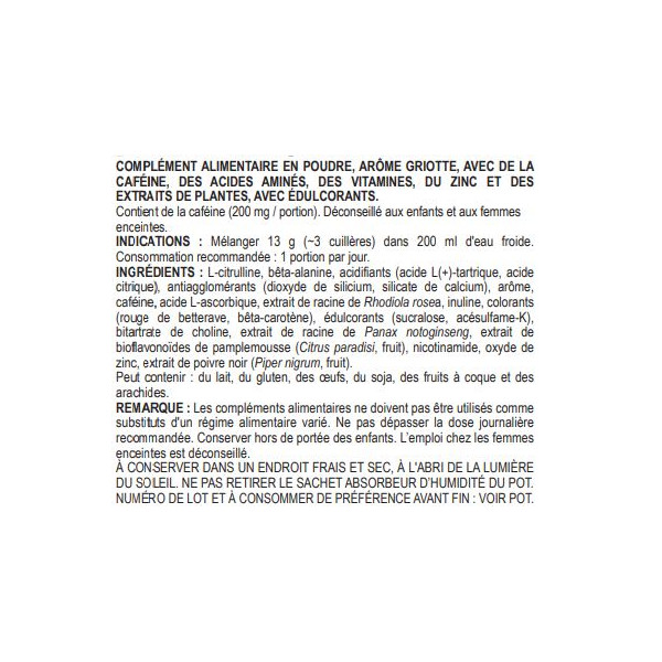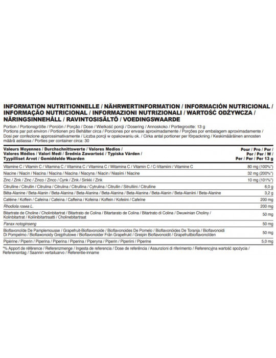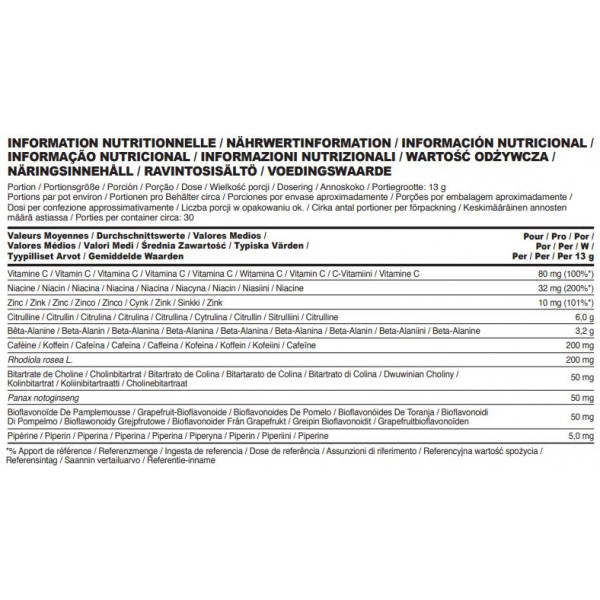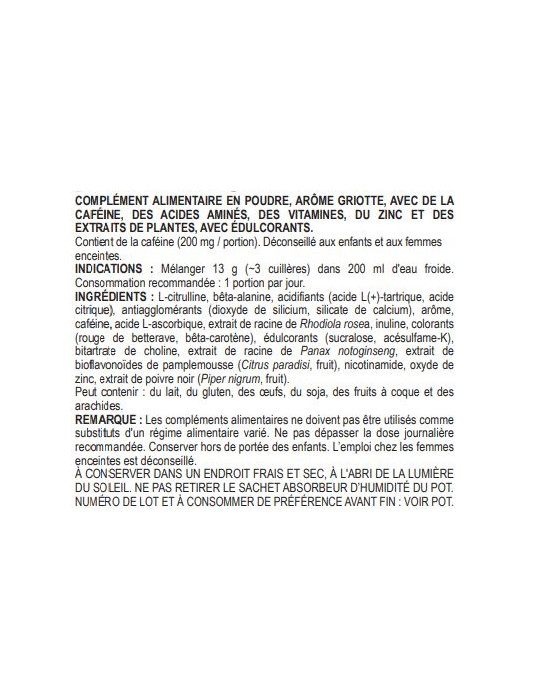 La caffeina contribuisce ad aumentare la vigilanza e a migliorare la concentrazione. Contiene anche zinco, rodiola rosea, bioflavonoidi del pompelmo e L-citrullina. Le matrici di questi ingredienti favoriscono la potenza, l'energia, la concentrazione, l'intensità dell'allenamento e la massima congestione muscolare.