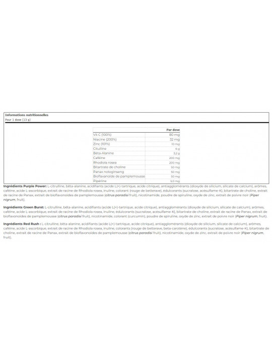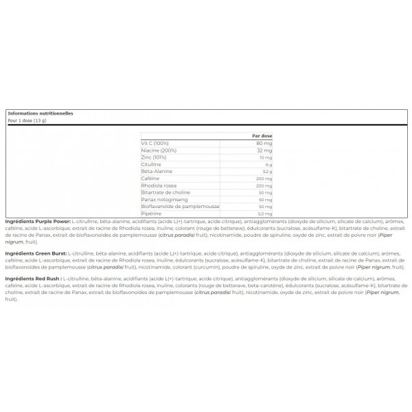 Ingredienti Purple Power: L-citrullina, beta-alanina, acidificanti (acido L(+)-tartarico, acido citrico), antiagglomeranti (biossido di silicio, silicato di calcio), aromi, caffeina, acido L-ascorbico, estratto di radice di Rhodiola rosea, inulina, colorante (rosso barbabietola), edulcoranti (sucralosio, acesulfame-K), colina bitartrato, estratto di radice di Panax, estratto di bioflavonoidi di pompelmo( frutto diCitrus paradisi ), nicotinamide, polvere di spirulina, ossido di zinco, estratto di pepe nero(frutto diPiper nigrum).