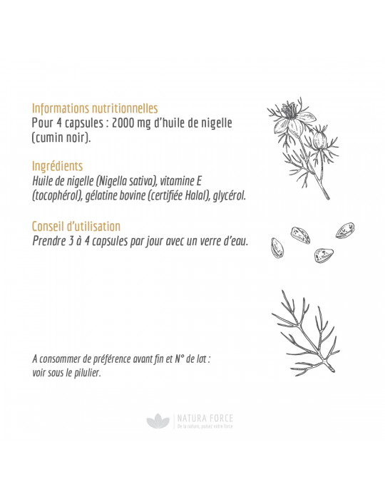 Ingredienti: olio di cumino nero (Nigella sativa), vitamina E (tocoferolo), capsula (amido di tapioca modificato, glicerolo, acqua).
