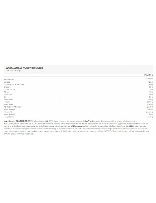 Ingredienti : ARACHIDI (25,5%), cioccolato al latte (25%) (zucchero, burro di cacao, LATTE intero in polvere , pasta di cacao, grasso del latte anidro(LATTE), emulsionante (lecitina SOJA), aroma naturale di vaniglia), sciroppo di glucosio, farina (farina di riso, farina di mais), umidificante (glicerolo), maltodestrina, zucchero di canna grezzo, olio di girasole, caramello (2,4%) (zucchero caramellato), lATTE scremato in polvere , sale marino, aroma naturale, emulsionante (lecitina SOJA), vitamine e minerali (citrato di magnesio concentrato, acido ascorbico, acido nicotinico, dl-alfa-tocoferolo acetato, calcio D-pantotenato, piridossina cloridrato, tiamina mononitrato, cianocobalamina), estratto di guaranà (0,5%) (maltodestrina, estratto di guaranà, caffeina (0,05%)*).*Alto contenuto di caffeina, sconsigliato ai bambini e alle donne in gravidanza.