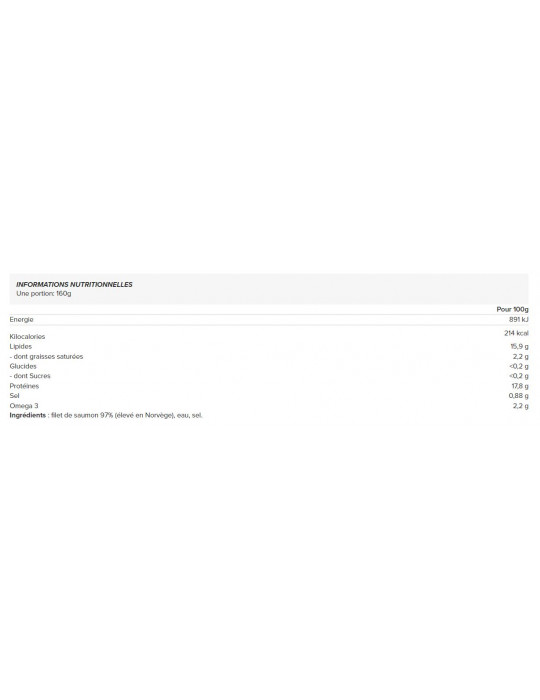 Peso netto : 160 gPreparate piatti deliziosi con questo filetto di salmone norvegese (160 g). Perfetto con un'insalata o una zuppa, con riso o pasta, in un panino o in crocchette di salmone... Potrete utilizzarlo più volte per pasti sani e gustosi.