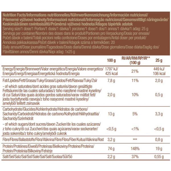 Realizzata con proteine in polvere di riso e pisello, contiene il 74% di proteine.