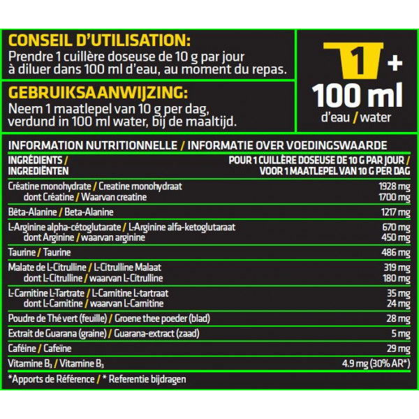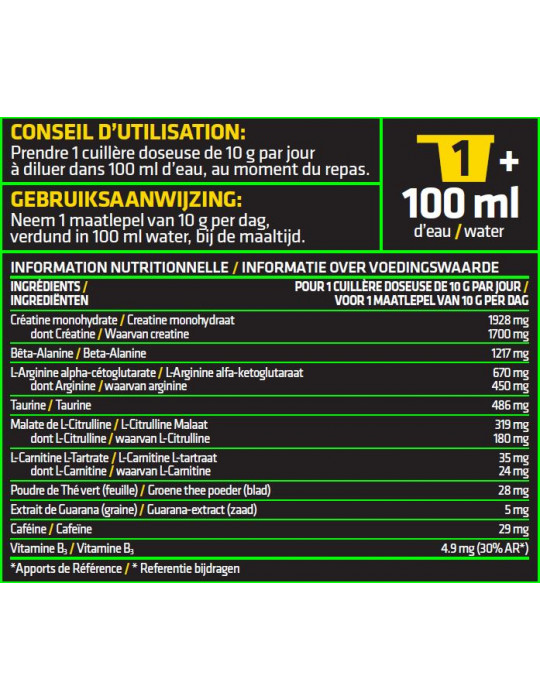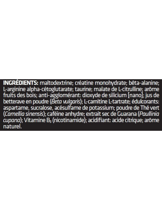 Altri ingredienti: [nano] Maltodestrina, creatina monoidrato; beta-alanina; L-arginina alfa-chetoglutarato; taurina; L-citrullina malato; aroma di frutti di bosco; antiagglomerante: biossido di silicio; succo di barbabietola in polvere (Beta vulgaris); L-carnitina L-tartrato; edulcoranti: aspartame, sucralosio, acesulfame di potassio; tè verde in polvere (camelia sinensis); caffeina anidra; estratto secco di guaranà (Paullinia cupana); vitamina B3 (nicotinamide); acidificante: acido citrico; aroma naturale.