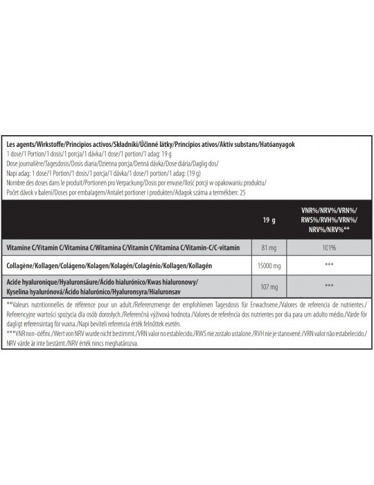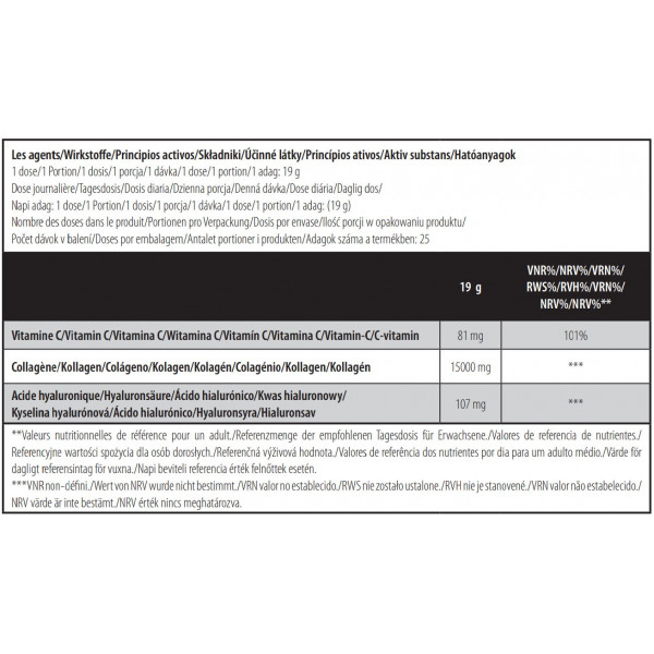 Inoltre, in questa formula, il collagene è combinato con acido ialuronico (107 mg) e vitamina C (81 mg) per una maggiore efficacia. La vitamina C favorisce la sintesi del collagene.