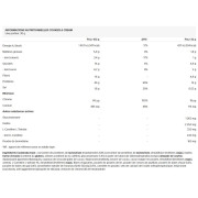 Ingredienti Cioccolato : concentrato di proteine siero di latte istantaneo 61% [concentrato di proteine da siero di latte, emulsionante: lecitine (soia)], cacao magro in polvere, inulina, farina d'avena (contiene glutine), glucomannano 3,5% (dal tubero Amorphophallus konjac) (contiene anidride solforosa), addensante (gomma di cellulosa), aromi, L-carnitina-L-tartrato 1%, emulsionante: lecitine (soia), fibra di agrumi, semi di lino in polvere, semi di piantaggine in polvere (dai semi di Plantago ovata), bacche di acai in polvere 0,6%, bacche di goji in polvere 0,6%, sale, bromelina in polvere 0,53%, sali di calcio dell'acido ortofosforico, estratto di chicco di caffè verde (Coffea robusta), edulcorante (sucralosio), agente antiagglomerante (biossido di silicio), cloruro di cromo (III).