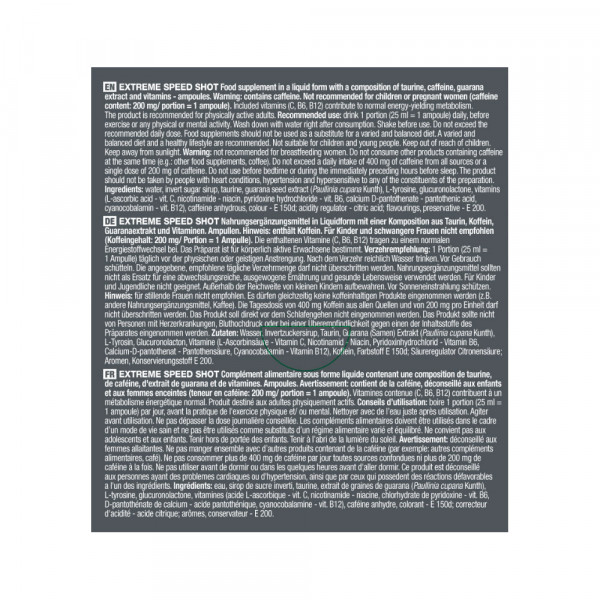 Non superare la dose giornaliera raccomandata. Non adatto a bambini e adolescenti. Tenere fuori dalla portata dei bambini Attenzione: Extreme Speed Shot contiene caffeina (200 mg per porzione). Il prodotto non deve essere assunto in gravidanza, durante l'allattamento o in caso di problemi cardiaci, ipertensione o ipersensibilità a uno dei prodotti contenuti nella formula.