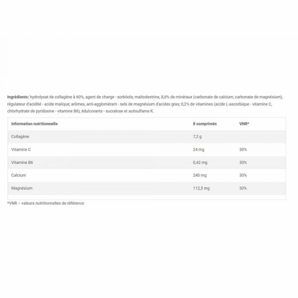 Ingredienti : 60% di idrolizzato di collagene, agente di carica - sorbitoli; maltodestrina, 8,6% di minerali (carbonato di calcio, carbonato di magnesio), regolatore di acidità - acido malico; aromi, agente antiagglomerante - sali di magnesio degli acidi grassi; 0,2% di vitamine (acido L-ascorbico - vitamina C, cloridrato di piridossina - vitamina B6), edulcoranti - sucralosio e acesulfame K.
