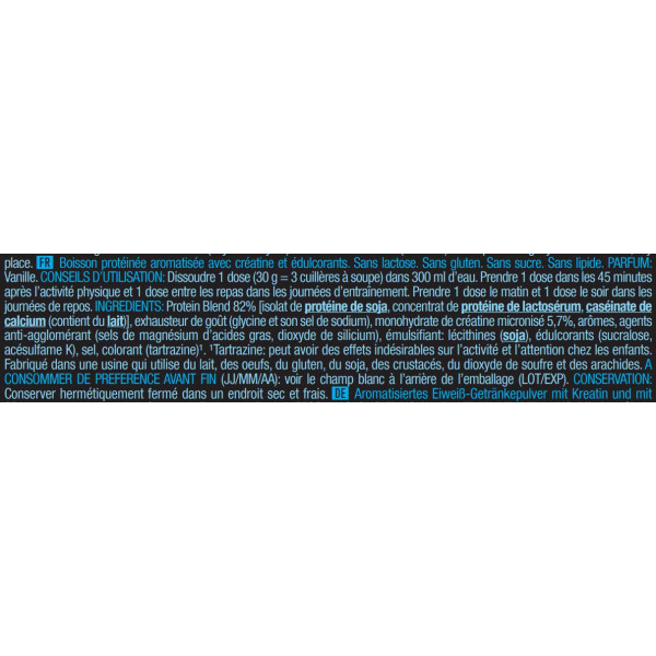 Ingredienti Vaniglia: miscela proteica 82% [proteine isolate della soia, proteine concentrate del siero di latte, caseinato di calcio (contiene latte)], esaltatore di sapidità (glicina e il suo sale di sodio), creatina monoidrato micronizzata 5,7%, aromi, agenti antiagglomeranti (sali di magnesio degli acidi grassi, biossido di silicio), emulsionante: lecitina(soia), edulcoranti (sucralosio, acesulfame K), sale, colorante (tartrazina)*. *Tartrazina: può avere effetti indesiderati sull'attività e l'attenzione dei bambini.