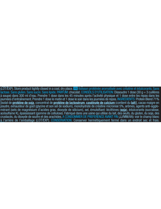 Ingredienti del cioccolato: miscela proteica 71% [isolato proteico di soia, concentrato proteico di siero di latte, caseinato di calcio (contiene latte)], cacao magro in polvere, esaltatore di sapidità (glicina e suo sale di sodio), creatina monoidrato micronizzata 5%, aromi, agenti antiagglomeranti (sali di magnesio degli acidi grassi, biossido di silicio), sale, emulsionante: lecitina(soia), edulcoranti (sucralosio, acesulfame K), addensante (gomma di cellulosa).