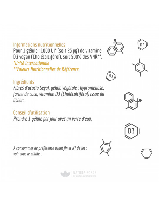 La vitamina D3 del marchio (150 caps) Natura Force è naturale al 100% e deriva da licheni vegetali .