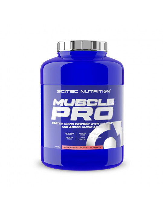 Muscle pro (2,5 kg ) è una formula che combina diverse fonti di proteine (animali e vegetali) arricchite con creatina prodotta dal marchio Scitec Nutrition.