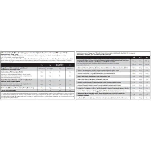 Ingredienti del cioccolato: proteine isolate di soia 73%, aromi, creatina monoidrato 5,7%, cacao sgrassato in polvere, proteine istantanee del siero di latte 3,3% [proteine del siero di latte concentrate, emulsionante : lecitina(soia)], concentrato di caseina micellare 1,7%, sale, L-arginina, L-glutammina, L-leucina, edulcoranti (acesulfame k, sucralosio), addensante (gomma di xanthan), L-valina, L-lisina, L-istidina, L-tritofano, L-teronina, L-isoleucina, L-fenilalanina, L-metionina.