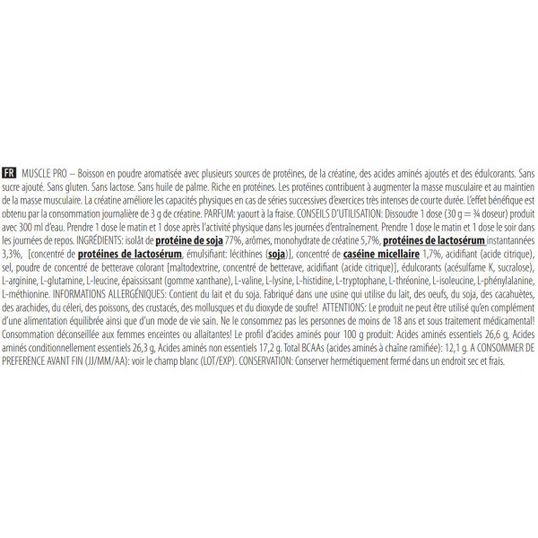 Ingredienti del Fraise-Yogurt : proteine isolate di soia 77%, aromi, creatina monoidrato 5,7%, proteine istantanee del siero di latte 3,3% [proteine del siero di latte concentrate, emulsionante : [maltodextrine, concentré de betterave, acidifiant (acide citrique)] lecitina(soia)], concentrato di caseina micellare 1,7%, acidificante (acido citrico), sale, concentrato di barbabietola in polvere, edulcoranti (acesulfame k, sucralosio), L-arginina, L-glutammina, L-leucina, addensante (gomma xantana), L-valina, L-lisina, L-istidina, L-tritofano, L-teronina, L-isoleucina, L-fenilalanina, L-metionina.