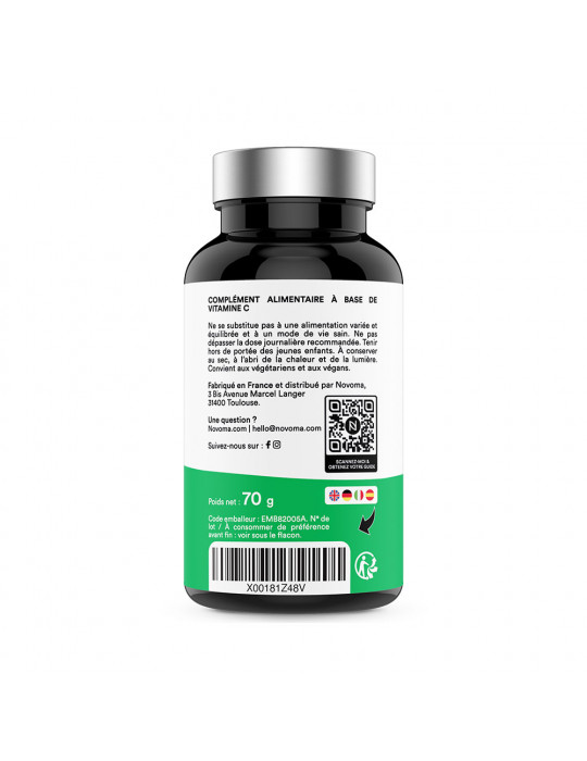 Novoma Vitamin C from è prodotto in Francia e offre un dosaggio ottimale di 1000 mg per una dose di 2 capsule.