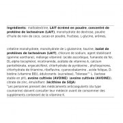 Ingredienti del cioccolato: maltodestrina, latte scremato in polvere, proteine del siero di latte concentrate(latte), destrosio monoidrato, olio di cocco in polvere, cacao in polvere, fruttosio, L-glicina, aromi, creatina monoidrato, L-glutammina monoidrato, taurina, [acide ascorbique, fumarate de fer, DL-alpha tocophérol, nicotinamide, acétate de vitamine A, calcium pantothénate, ergocalciférol, chlorydrate de pyridoxine, phylloquinone, chlorhydrate de thiamine, riboflavine, cyanocobalamine, acide folique, D-biotine (vitamine B8)] proteine isolate del siero di latte(latte), cloruro di sodio, stabilizzante (gomma di xanthan), miscela di vitamine, edulcorante (sucralosio), Tolerase L (lattosio stabile al pH), avena coltivata, citrato di zinco, emulsionante (lecitina di soia).