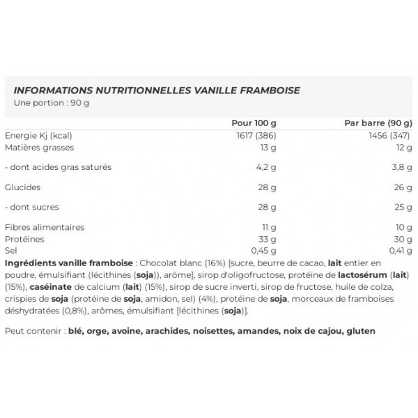 Ingredienti lampone alla vaniglia: Cioccolato bianco (16%) [zucchero, burro di cacao, latte intero in polvere, emulsionante (lecitine(soia)), aroma], sciroppo di oligofruttosio, proteine del siero di latte(latte) (15%), caseinato di calcio(latte) (15%), sciroppo di zucchero invertito, sciroppo di fruttosio, olio di colza, crispies di soia (proteine di soia, amido, sale) (4%), proteine di soia, pezzi di lampone disidratati (0,8%), aromi, emulsionante [lecitina(soia)].