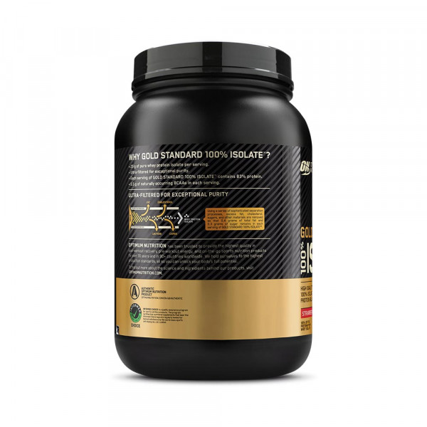 100% Isolate Gold Standard (930 g) è una miscela di siero di latte isolato e idrolizzato che, grazie al processo di filtrazione, è estremamente pura. Il risultato finale è l'83% di proteine complete (25 g per porzione) per aumentare e mantenere la massa muscolare.